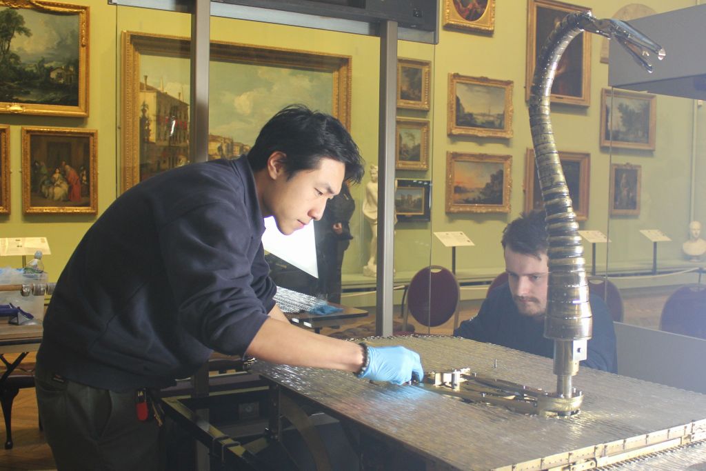 Jong Chan Li and Ted Cliffe from the Cumbria Clock Company worked on the glass rods that create the illusion of flowing water for the 18th century automaton.